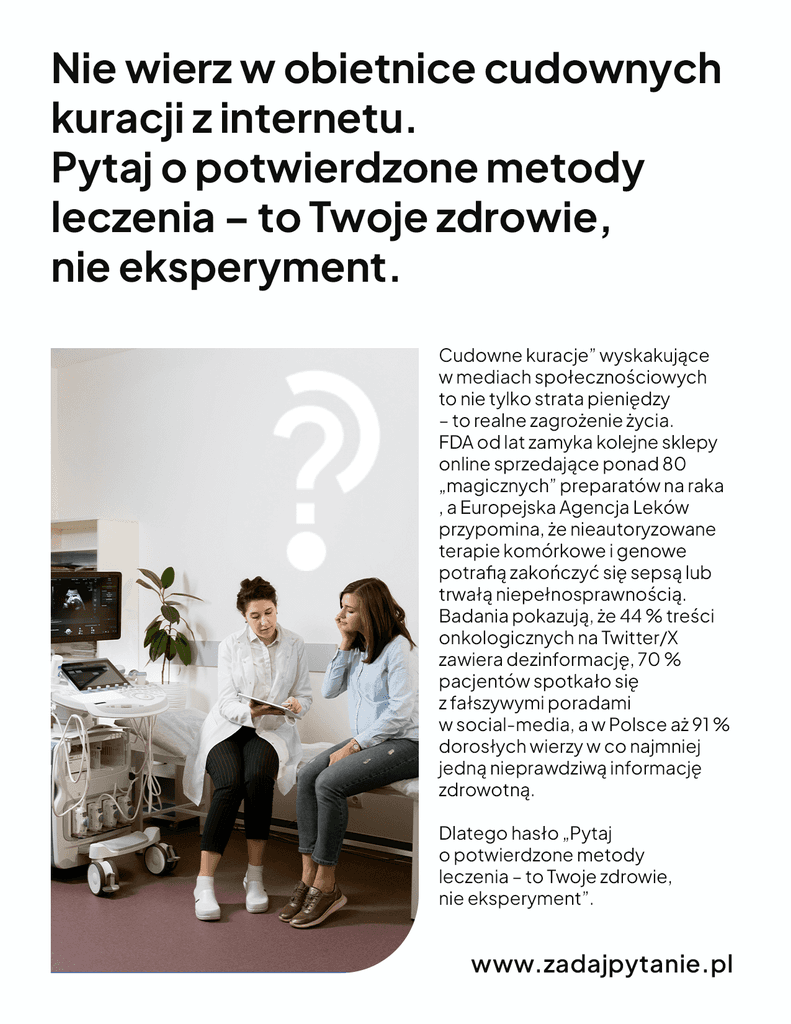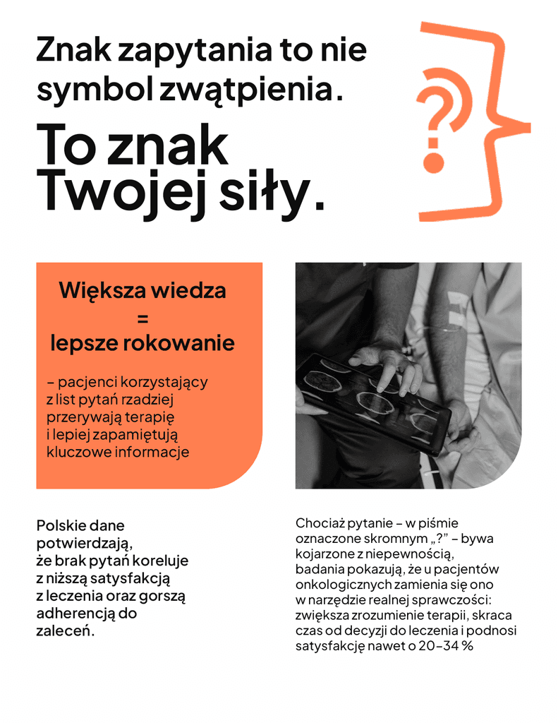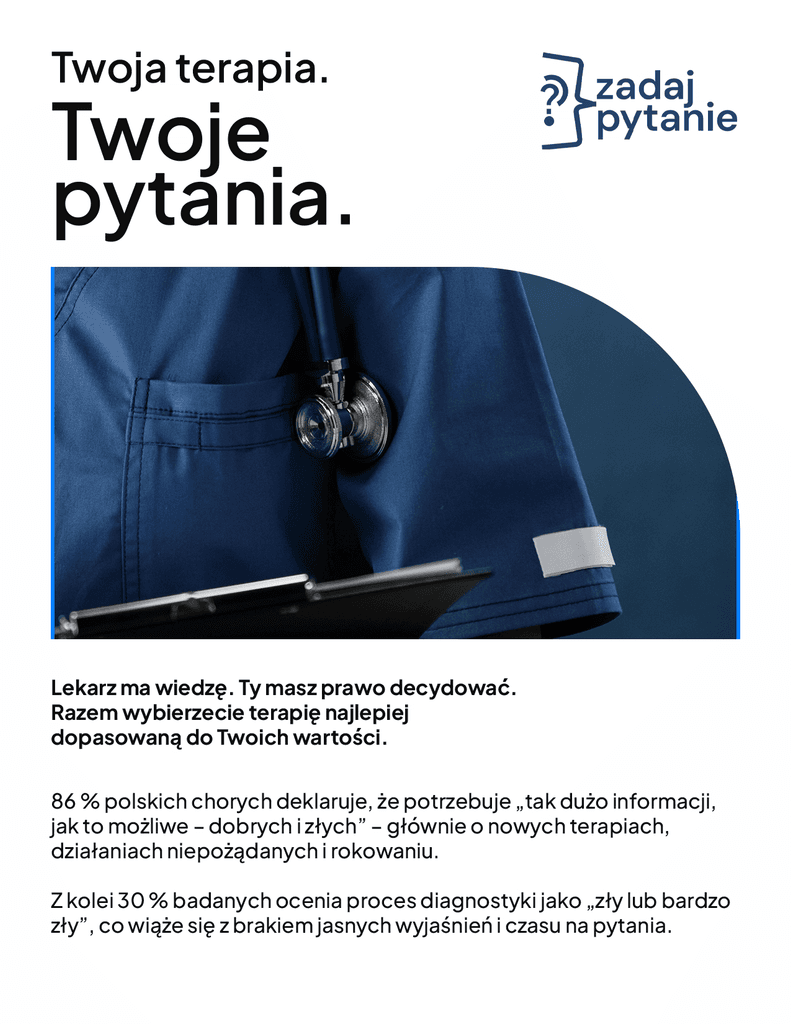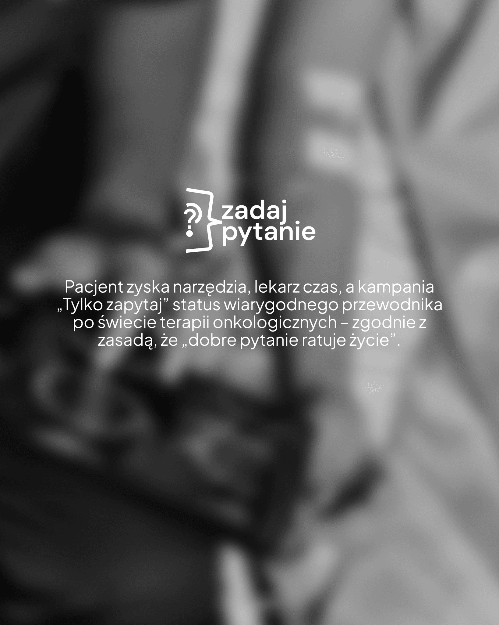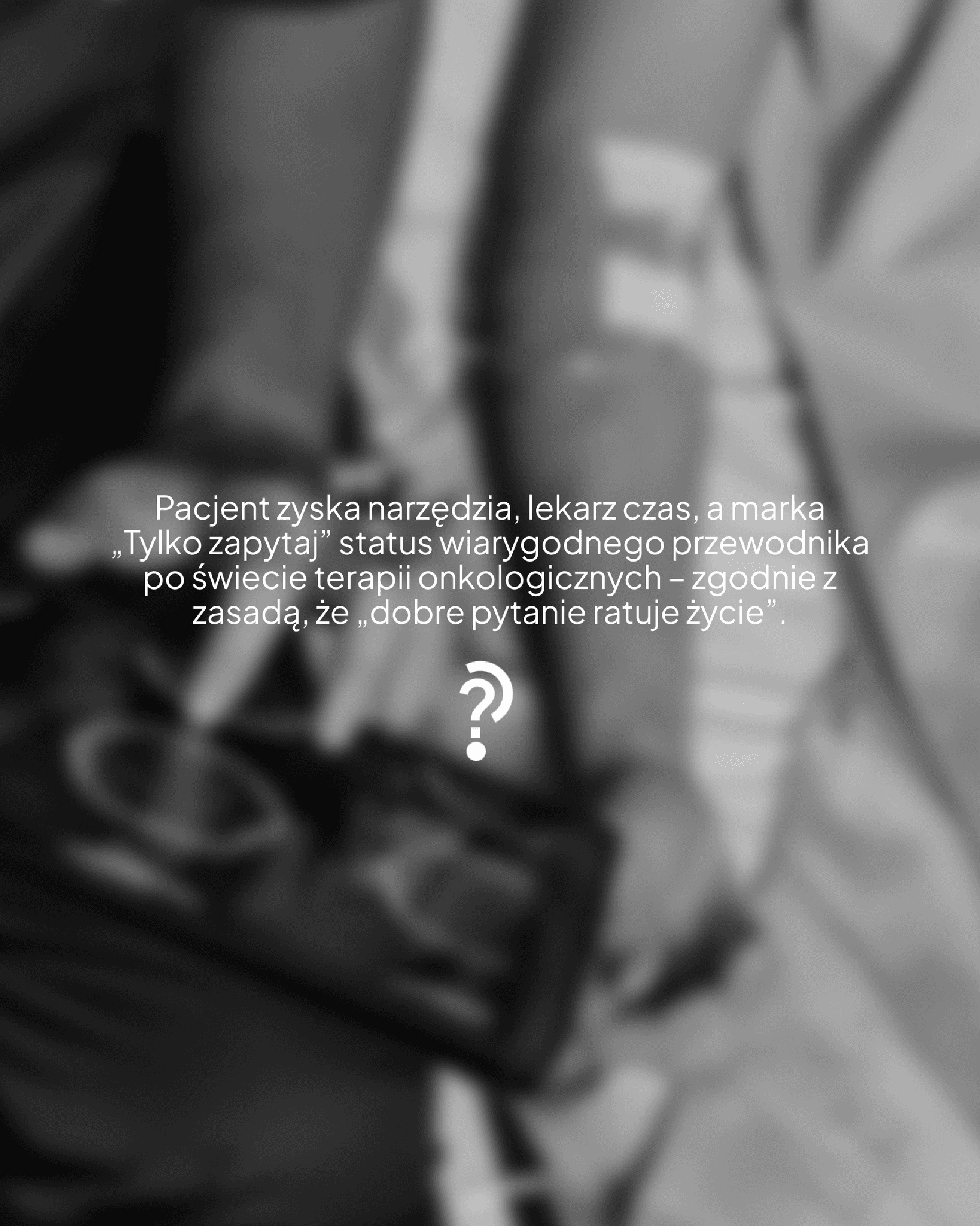 Ostateczny Efekt: pacjent czuje się zaopiekowany, poinformowany i zmotywowany do działania. Przełamujemy bariery emocjonalne i poznawcze, sprawiając, że zadanie pytania staje się naturalnym, wzmacniającym krokiem. Kampania "Tylko zapytaj" staje się synonimem wiarygodnego przewodnika i realnego wsparcia.